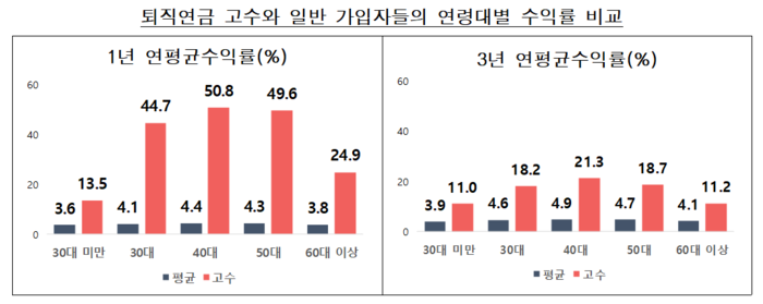 금융감독원이 26일 발표한 ‘우리나라 퇴직연금 투자백서Ⅱ’에 따르면 이른바 ‘퇴직연금 고수’로 분류된 가입자들의 최근 1년 수익률은 38.8%, 최근 3년 연평균 수익률은 16.1% 였다. 전체 가입자 평균(1년 4.2%, 3년 4.6%)과 비교하면 3.5~9.2배 높은 성과다.