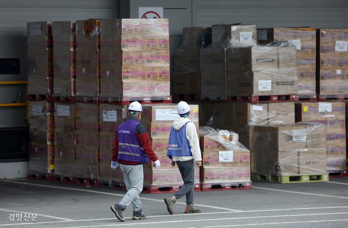 뒤숭숭 50대 단기 계약직 노동자가 새벽에 카트에서 상품을 담아 옮기는 집품 업무를 하던 중 쓰러져 숨진 26일 경기 광주시의 한 쿠팡 물류센터에서 직원들이 쌓여 있는 물품 앞을 지나고 있다. 권도현 기자 lightroad@kyunghyang.com |