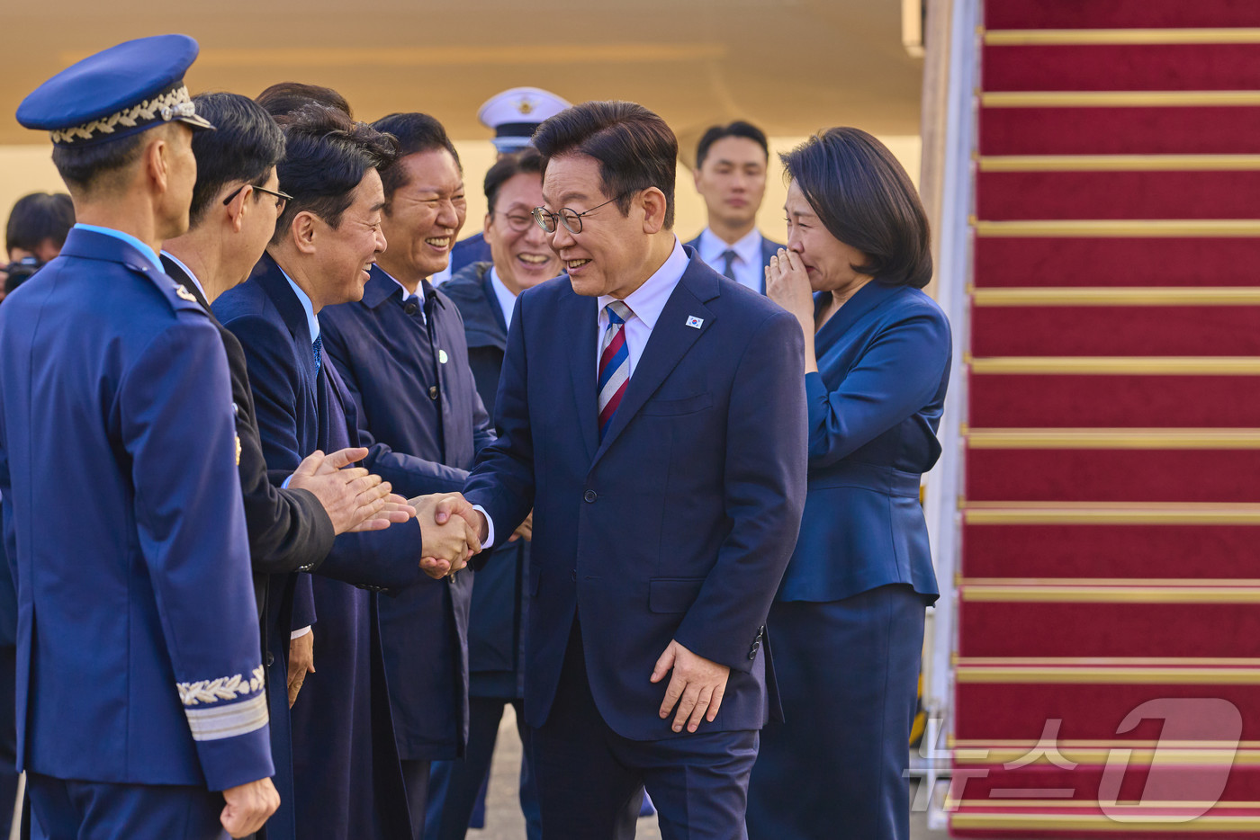 (서울=뉴스1) 이재명 기자 = 아프리카·중동 4개국 순방 일정을 마무리한 이재명 대통령과 김혜경 여사가 26일 경기도 성남시 서울공항을 통해 귀국하고 있다.(대통령실 제공. 재판매 및 DB 금지) 2025.11.26/뉴스1