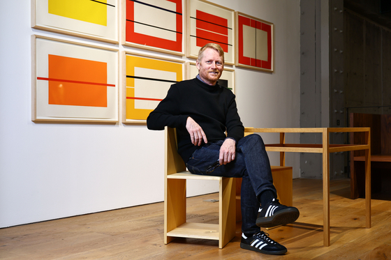 1970년대 도널드 저드가 디자인한 의자에 앉은 장남 플래빈 저드. 26일 서울 이태원 현대카드 스토리지 전시장에서 중앙일보와 만났다. 김종호 기자 |