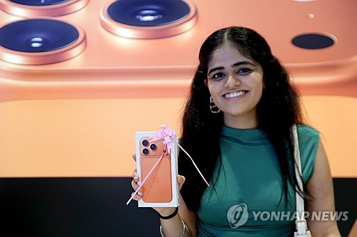지잔 9월 19일(현지시간) 인도 콜카타에서 열린 애플 신제품 출시 행사에서 한 소비자가 아이폰17 프로 제품을 들어보이고 있다. [EPA=연합뉴스 자료사진] |