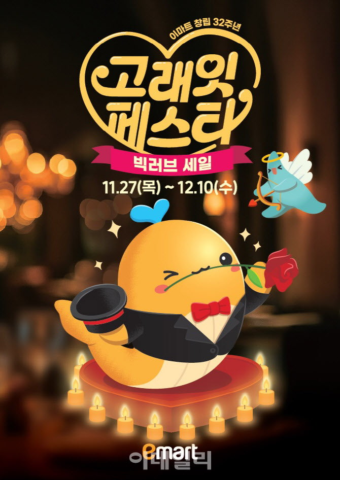 27일 이마트에 따르면 올해 ‘고래잇 페스타’는 ‘빅 러브세일’을 테마로 기획했다. 행사 첫 주(11월 27일~12월 1일)에는 매 행사마다 완판을 기록한 삼겹살 200톤을 포함해 겨울 조개 100톤, 햇딸기 125톤 등 대형 물량이 행사카드 결제 시 반값에 제공한다.