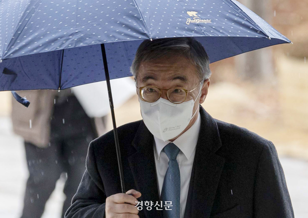 사법농단 의혹의 실무 책임자로 지목된 임종헌 전 법원행정처 차장이 지난해 2월5일 서울중앙지법에서 열린 1심 선고에 출석하고 있다. 문재원 기자 |