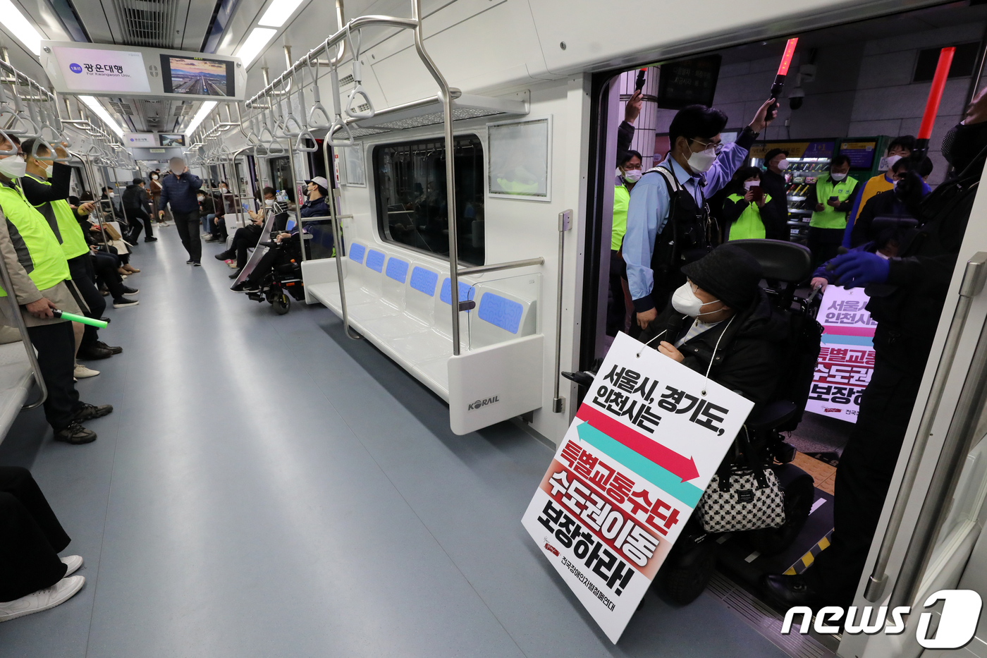 (서울=뉴스1) 이비슬 기자 = 전국장애인차별철폐연대(전장연) 지하철 탑승시위로 27일 오전 출근길 서울 지하철 4호선 혜화역에서 열차가 무정차 통과하고 있다.