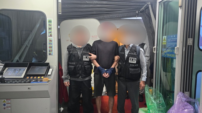 경찰청과 문화체육관광부는 27일 오전 인천국제공항을 통해 국내외 저작물을 무단으로 게시한 총책과 캄보디아 거점 연애 빙자 사기(로맨스 스캠) 조직원 등 해외 도피사범 2명을 강제송환했다. 사진은 로맨스스캠 조직원을 붙잡은 모습. [사진=경찰청] |