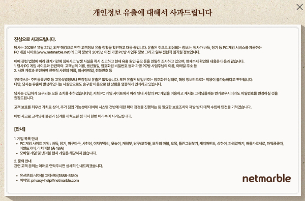 넷마블이 26일 자사 홈페이지를 통해 고객정보가 유출된 정황을 확인했다고 밝혔다(이미지=넷마블 홈페이지) |