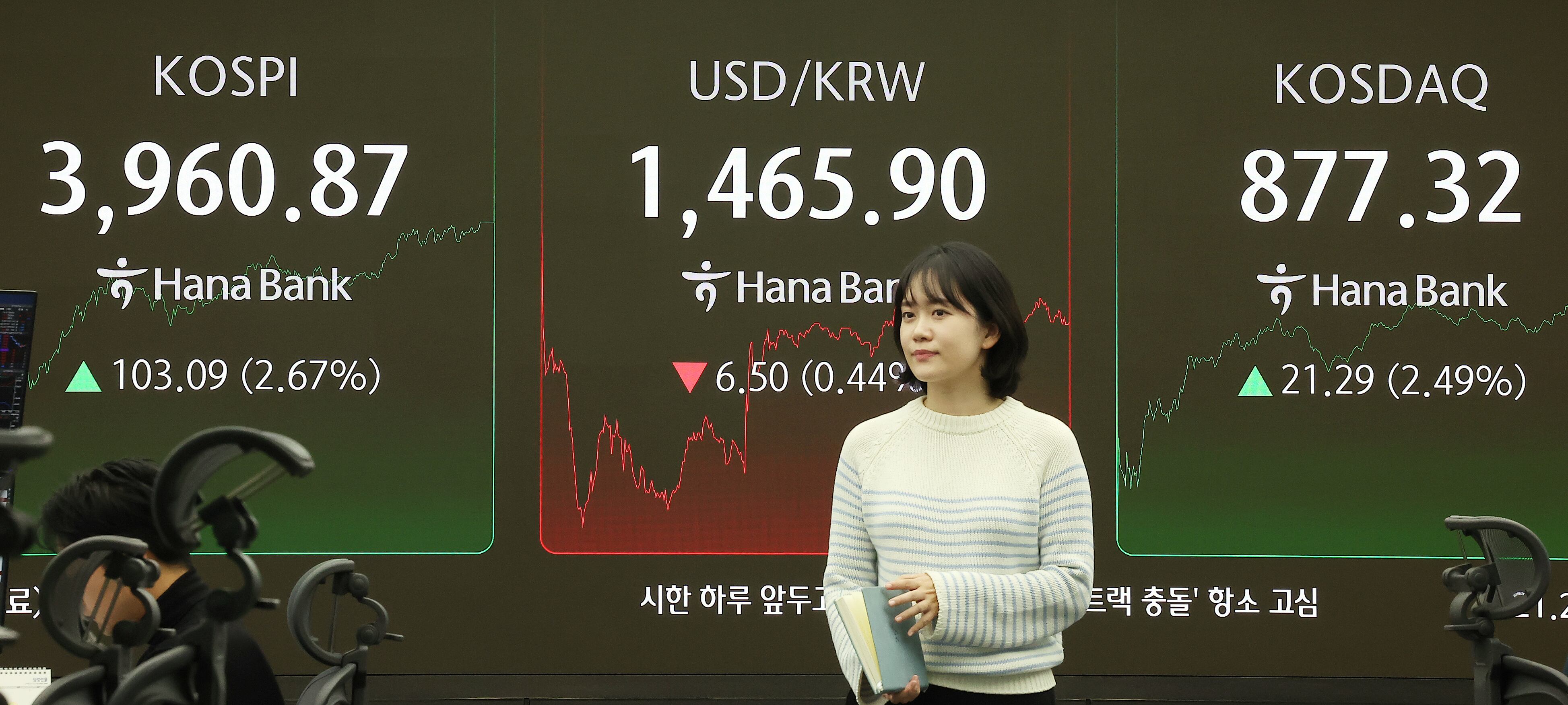 26일 오후 서울 중구 하나은행 딜링룸 전광판에 코스피 지수가 전 거래일 대비 103.09포인트(2.67%) 오른 3960.87을 나타내고 있다. /뉴스1 |