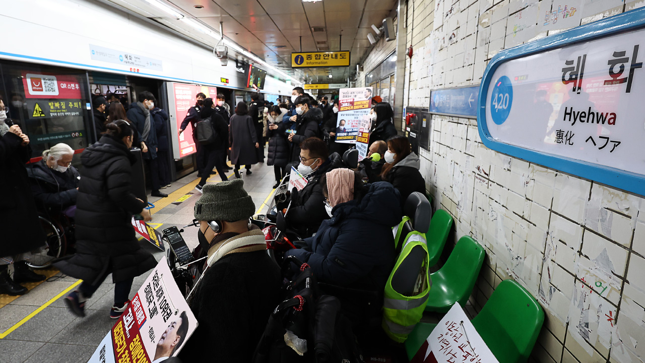 오늘(27일) 아침 전국장애인차별철폐연대(전장연) 시위로 서울 지하철 4호선 혜화역에서 열차가 한때 무정차 통과해 출근길 시민들이 불편을 겪었습니다.