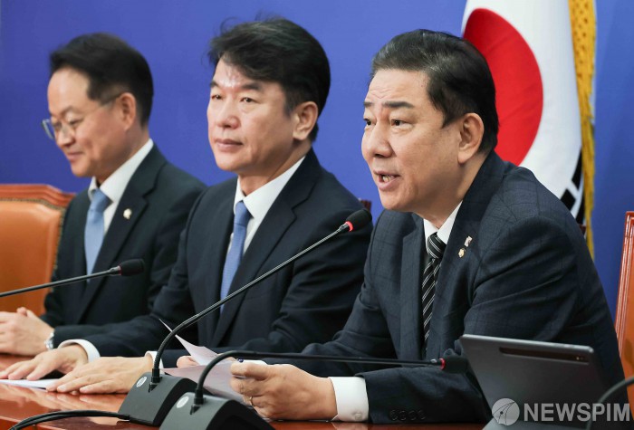 [서울=뉴스핌] 윤창빈 기자 = 김병기 더불어민주당 원내대표가 27일 서울 여의도 국회에서 열린 정책조정회의에서 모두발언을 하고 있다. 2025.11.27 pangbin@newspim.com