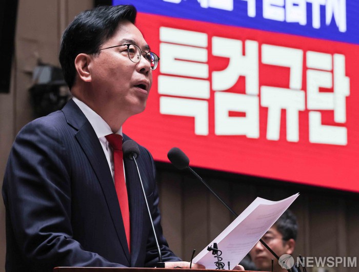 [서울=뉴스핌] 윤창빈 기자 = 송언석 국민의힘 원내대표가 27일 서울 여의도 국회에서 열린 의원총회에서 모두발언을 하고 있다. 2025.11.27 pangbin@newspim.com
