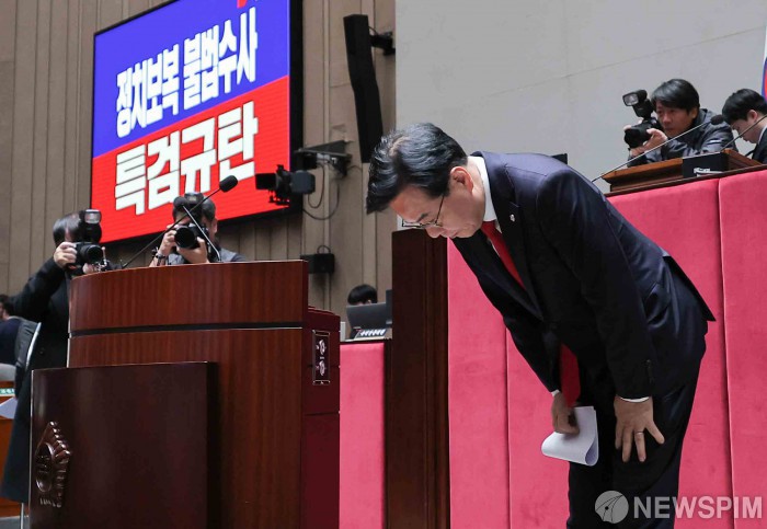 [서울=뉴스핌] 윤창빈 기자 = 송언석 국민의힘 원내대표가 27일 서울 여의도 국회에서 열린 의원총회에서 모두발언에 앞서 인사를 하고 있다. 2025.11.27 pangbin@newspim.com
