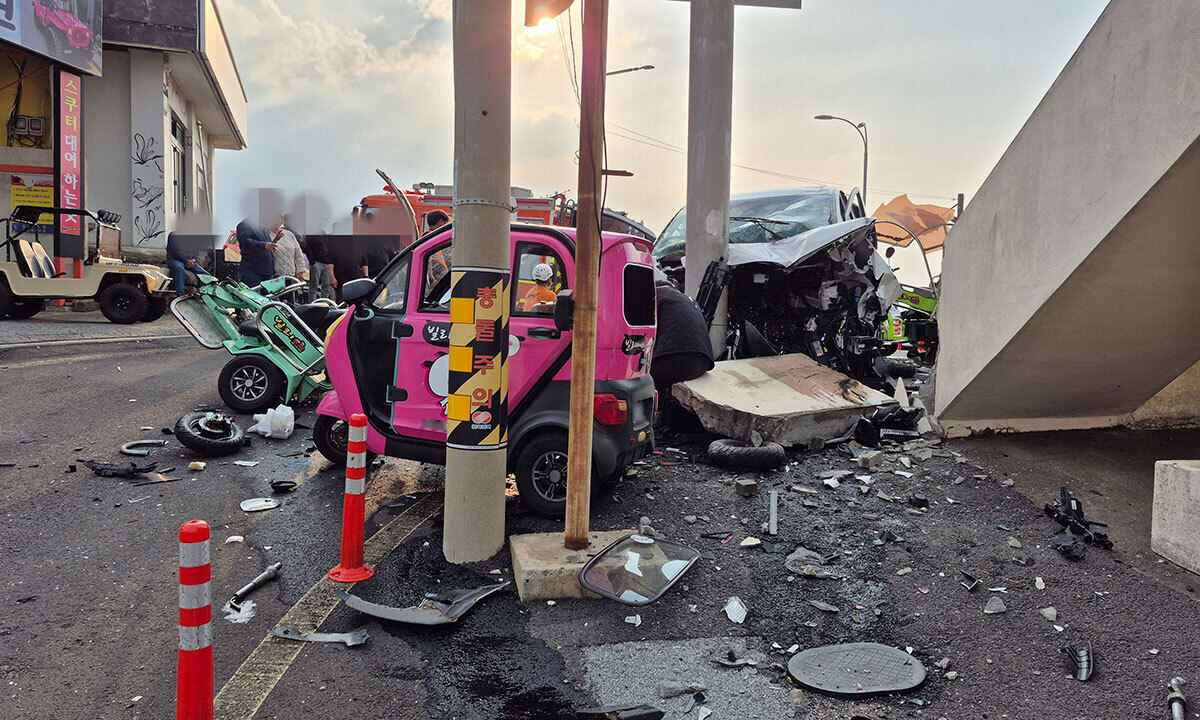 24일 제주 우도 천진항에서 60대 운전자가 몰던 승합차가 도항선 대합실 옆 도로표지판 기둥을 향해 돌진해 관광객 14명의 사상자가 발생했다. 제주시 우도 사고 현장. 독자 제공 |