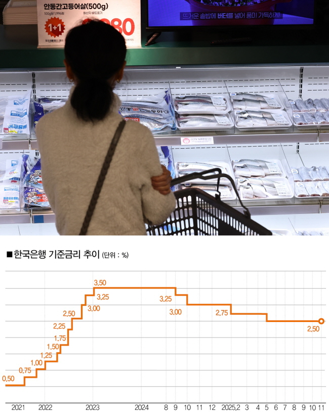 물가도 금리 인하에 제동을 거는 변수로 작용했다. 여행 관련 서비스와 농축수산물 가격이 올랐고, 환율 상승으로 석유류 가격까지 뛰면서 10월 소비자물가 상승률은 2.4%, 근원물가는 2.2%로 높아졌다.