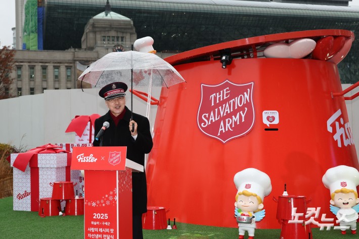 한국 구세군 김병윤 사령관이 27일 오전 서울광장에서 열린 ‘2025 휘슬러·구세군 사랑의 레시피 팟 자선냄비 전달식’ 에 참석해 인사말 하고 있다.