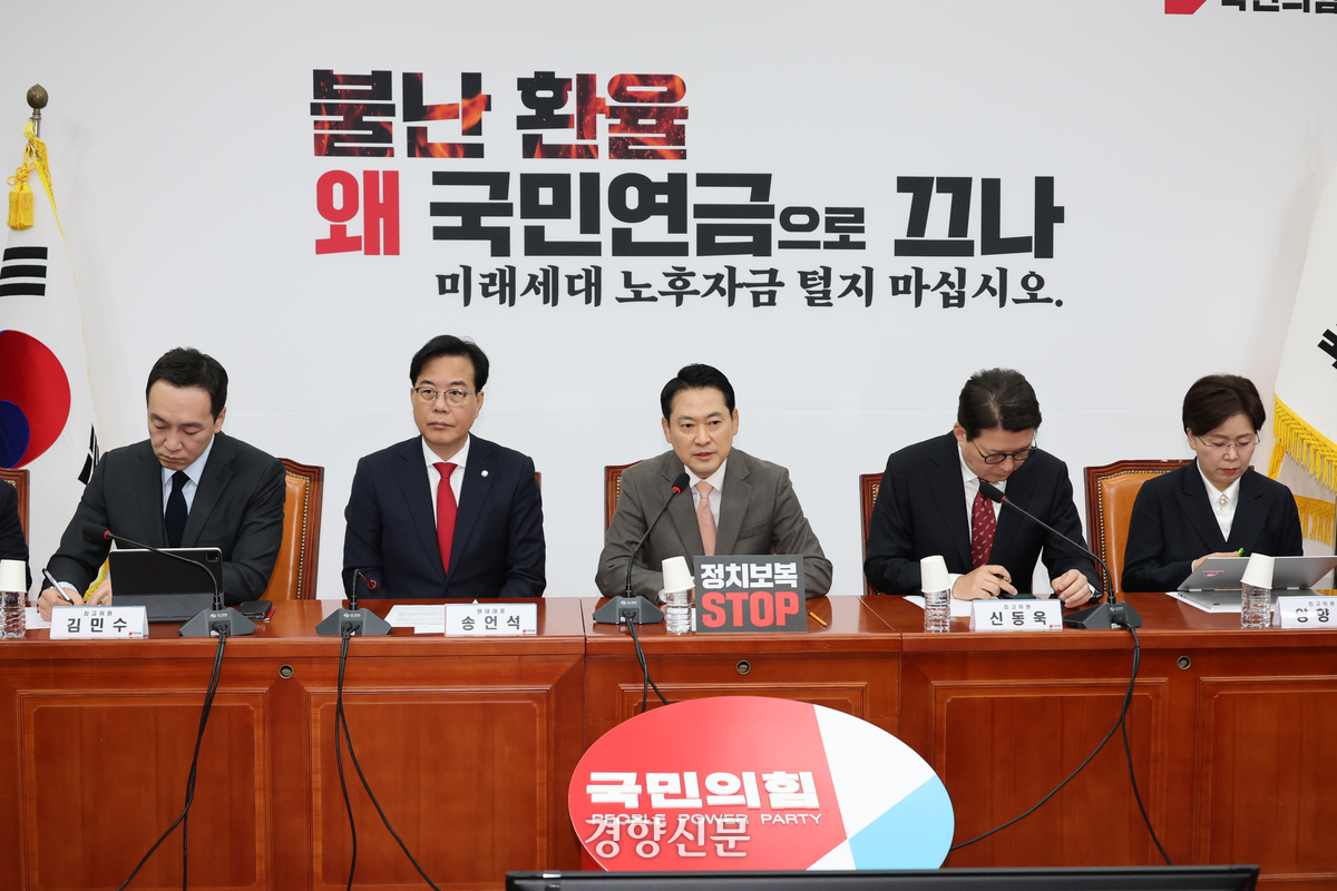 장동혁 국민의힘 대표(가운데)가 27일 국회에서 열린 최고위원회의에서 발언하고 있다. 박민규 선임기자 |