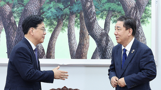 김병기 더불어민주당 원내대표와 송언석 국민의힘 원내대표가 25일 서울 여의도 국회에서 회동하고 있다. 뉴스1 |
