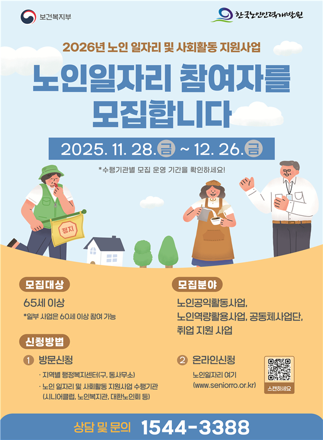 2026년 노인일자리사업은 28일부터 방문 또는 온라인을 통해 신청할 수 있다.