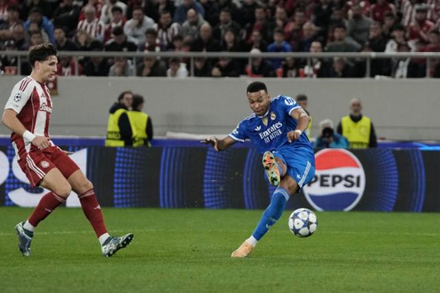 레알 마드리드의 킬리안 음바페가 27일 그리스 피레아스의 카라이스카키스 스타디움에서 열린 2025~26시즌 유럽축구연맹(UEFA) 챔피언스리그(UCL) 리그 페이즈 5차전 올림피아코스와의 경기에서 전반 29분 해트트릭을 완성하고 있다. 피레아스=AP 뉴시스 |