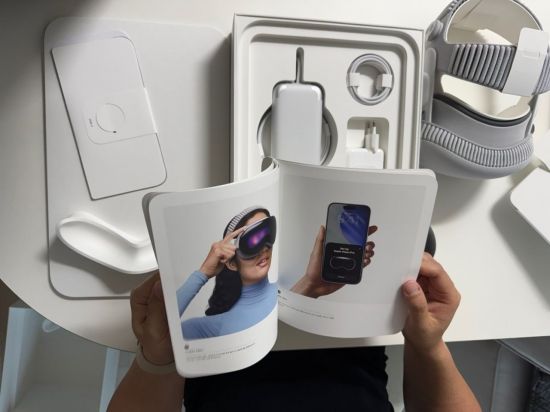 신형 애플 비전 프로 구성품에는 새로운 듀얼 니트 밴드, 라이트실, 기기 전면 커버, 광택용 천, 배터리, USB-C 충전 케이블과 40W 다이내믹 전원 어댑터(최대 60W)가 포함돼 있다. 컬러 설명서도 동봉돼있다. 사진=박유진 기자 |