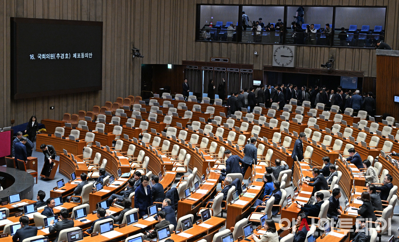 아시아투데이 송의주 기자 = 국민의힘 의원들이 27일 국회에서 열린 본회의에서 추경호 국민의힘 의원 체포동의안 표결을 앞두고 퇴장하고 있다.