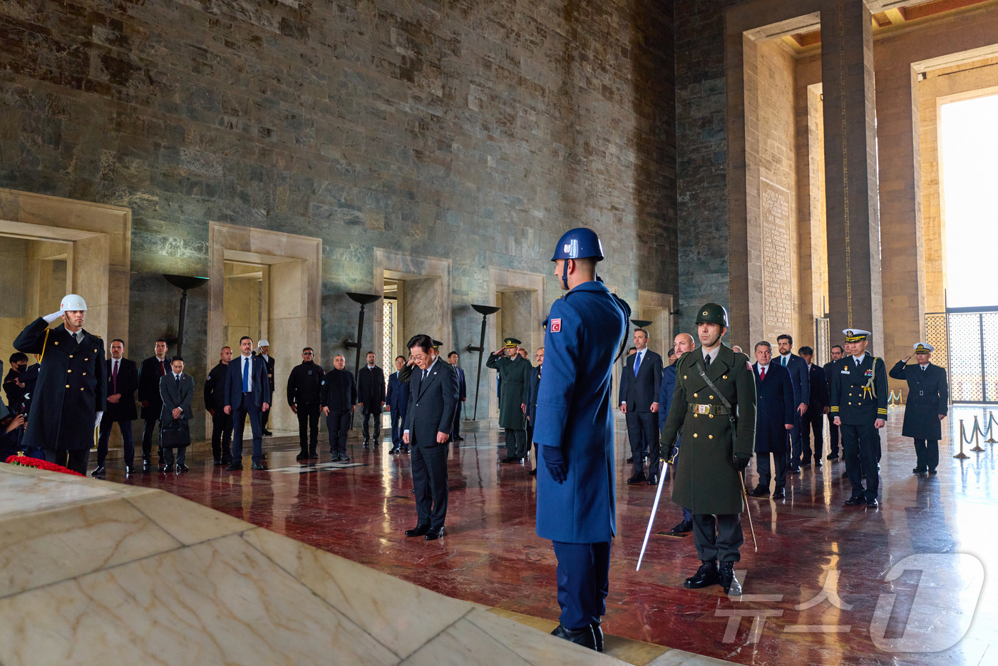 (서울=뉴스1) 이재명 기자 = 튀르키예를 국빈 방문 중인 이재명 대통령이 24일(현지시간) 앙카라 아니트카비르에서 튀르키예의 국부 무스타파 케말 아타튀르크 묘소를 찾아 헌화 후 묵념하고 있다. (이재명 대통령 SNS. 재판매 및 DB 금지) 2025.11.27/뉴스1