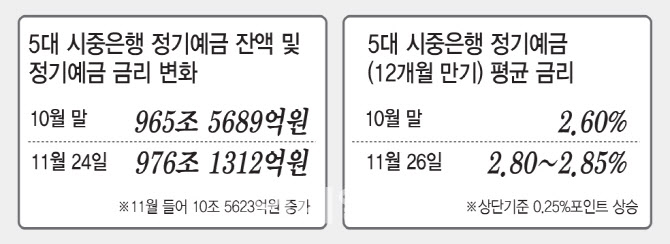 주식시장으로 빠져나가던 은행권 자금이 이달 들어 예금으로 다시 발길을 돌린 원인은 높아진 금리에서 찾을 수 있다. 5대 은행의 이달 26일 기준 정기예금(12개월 만기) 금리는 연 2.80~2.85%로 10월 말(2.60%)와 비교해 상단 기준 0.25%포인트 상승했다. 같은 기간 한국은행 기준금리는 2.50%를 유지했지만 은행이 자금 증시 이탈과 시장 금리 상승 등을 반영해 예금 금리를 올려온 것이다. 실제 5대 은행 대표 정기예금(12개월 만기)의 최고 금리는 KB국민은행 ‘KB스타정기예금’ 연 2.85%과 신한은행 ‘쏠편한 정기예금’ 연 2.80%, 하나은행 ‘하나의 정기예금’ 연 2.85%, 우리은행 ‘WON플러스 예금’ 연 2.85%, NH농협은행 ‘NH올원e예금’ 연 2.85% 등으로 모두 연 3%에 근접한 상황이다.