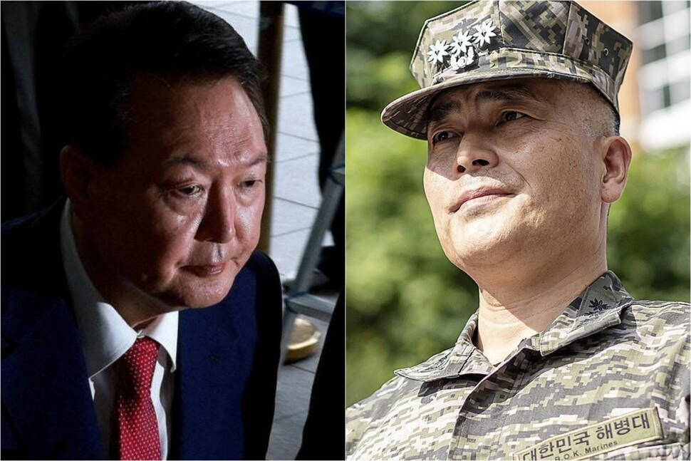 (왼쪽) 윤석열 전 대통령이 지난 7월 5일 오전 서울 서초동 서울고검에 마련된 내란 특검에 피의자 신분으로 출석하고 있다. 공동취재사진 (오른쪽) 박정훈 해병대 대령이 2023년 9월 5일 서울 국방부 군 검찰에 출석하는 모습. 연합뉴스 |