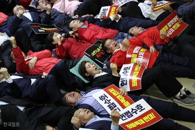 지난해 4월 서울 여의도 국회에서 나경원 당시 자유한국당 원내대표와 의원들이 선거제도 개혁법안이 패스트트랙에 지정되자 회의장 밖에서 항의하고 있다. 한국일보 자료사진 |