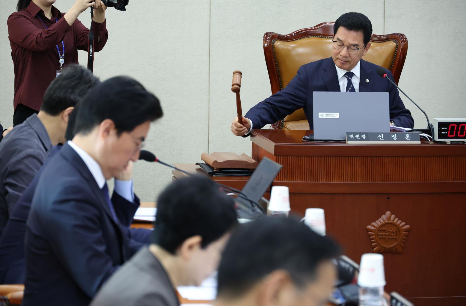 = 신정훈 국회 행정안전위원회 위원장이 18일 오전 서울 여의도 국회에서 2026년도 예산안 등 의결을 위해 열린 전체회의에서 의사봉을 두드리고 있다. 2025.11.17. 뉴시스 |