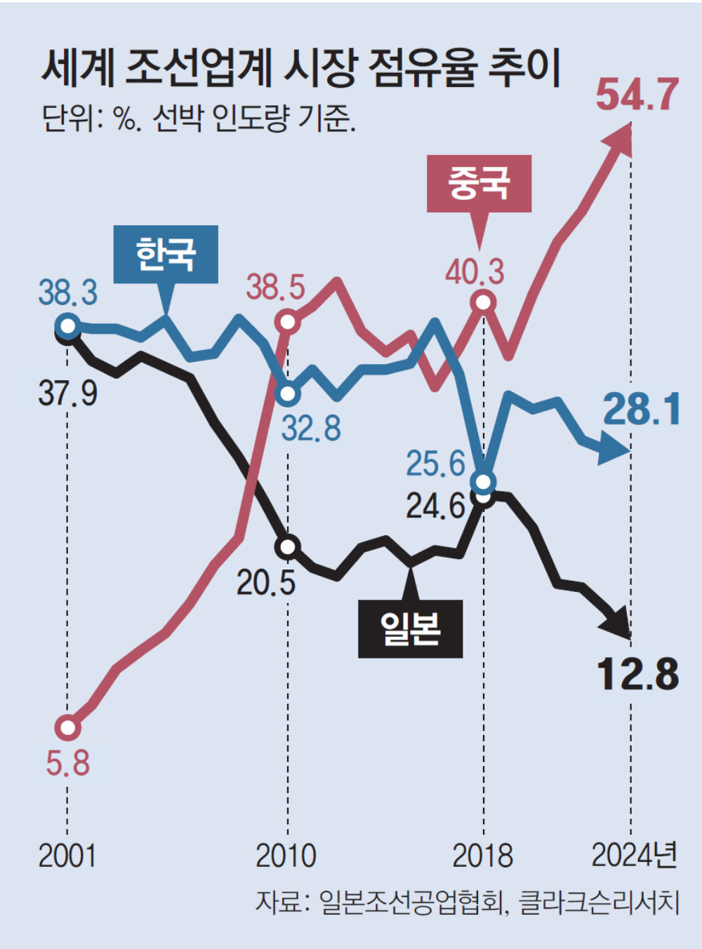 시장조사 기관 클라크슨 리서치에 따르면 지난해 기준 세계 조선업 점유율(선박 인도량 기준)은 중국 54.7%, 한국 28.1%, 일본 12.8%, 미국 1% 미만이다. 미국은 중국의 조선업을 견제하고 국방력을 강화하기 위해 동맹인 한국, 일본의 조선업 협력을 강조하고 있다. 닛케이는 “조선업은 일본의 경제안보뿐 아니라 트럼프 행정부와의 협력을 위해서도 중요성이 높아졌다”고 진단했다.