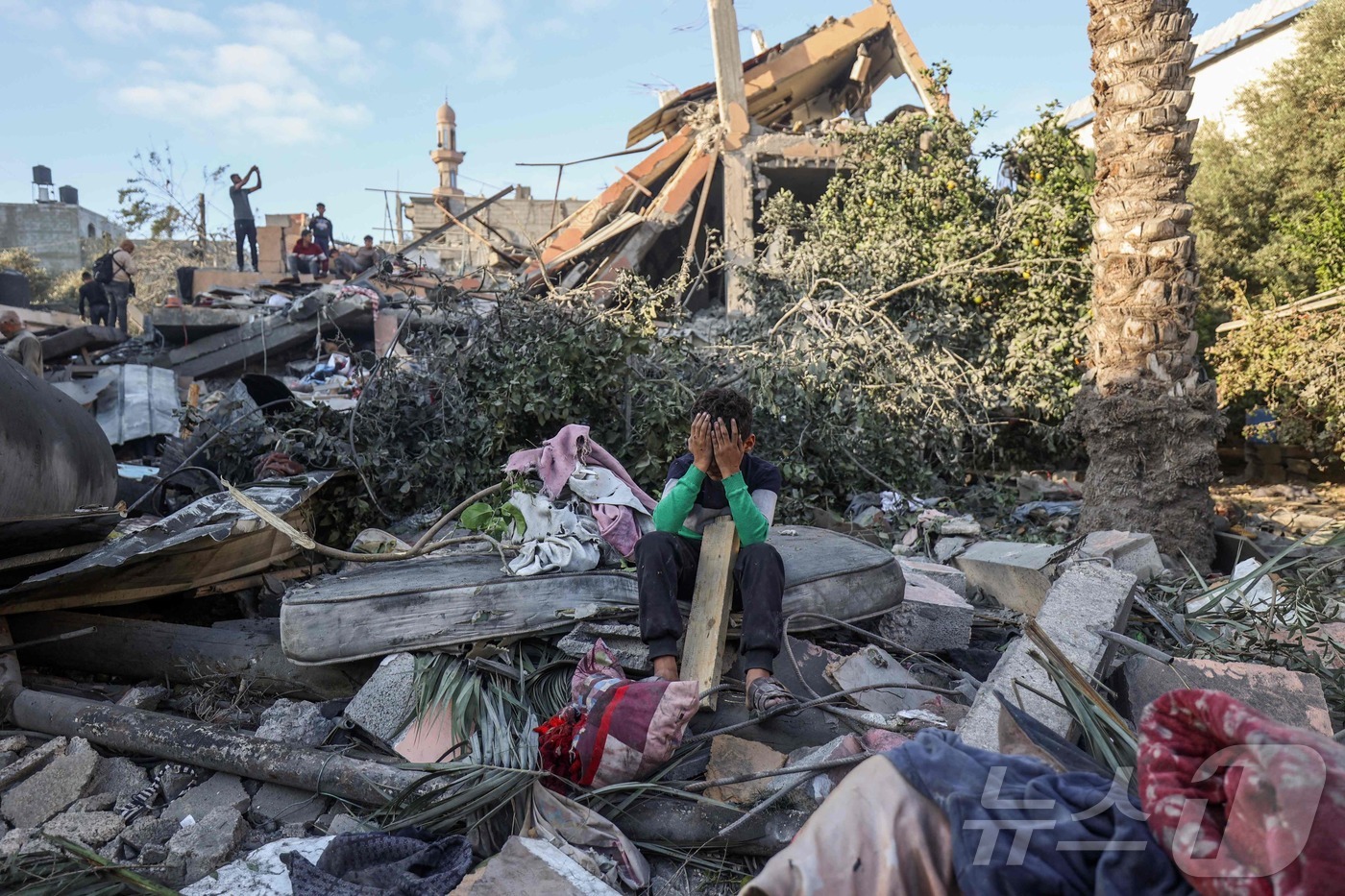 29일(현지시간) 가자지구 중부 누세이라트에서 이스라엘 공습으로 파괴된 집의 잔해에 앉아 한 소년이 울고 있다. 2025.10.29 ⓒ AFP=뉴스1 ⓒ News1 김경민 기자 |