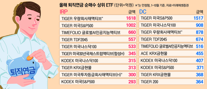 미국 대표 지수를 추종하는 ETF의 약진도 두드러진다. 지난해까지만 해도 IRP·DC 계좌에서 S&P500이나 나스닥100에 투자하는 상품은 상위 10권 내 1~2개에 그쳤지만, 올해는 각각 4개씩 포함됐다. 특히 DC 계좌의 경우 ‘TIGER 미국 S&P500’이 1517억원으로 순매수 1위를 차지했고, ‘TIGER 미국나스닥100’(908억원)이 2위였다. 미국 지수 ETF가 연금 투자자들 사이에서 핵심 투자처로 자리 잡고 있는 모습이다.