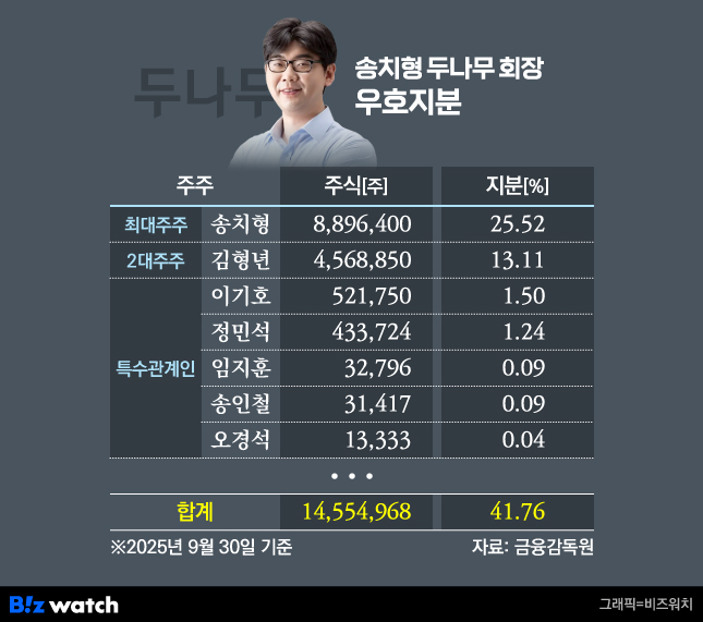 관건은 출석 주주의 3분의 2 이상 찬성표를 받는 것이다. 네이버파이낸셜은 네이버가 지분 69%를 보유해 주총 통과에 큰 무리가 없다. 하지만 두나무는 송치형 두나무 회장(25.5%)·김형년 부회장(13.1%)·특수관계인을 포함한 지분이 41.7%로, 주총을 통과하려면 약 25%의 우군을 더 확보해야 한다.