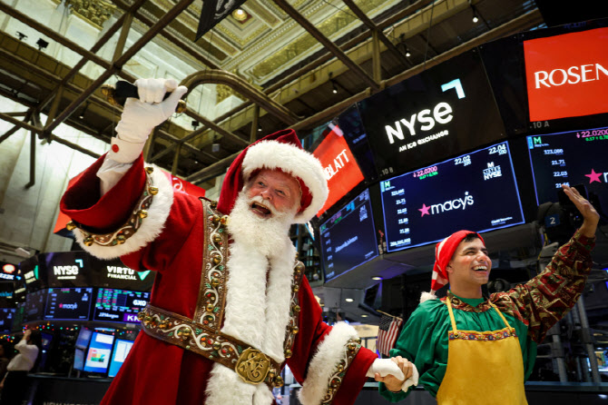 26일(현지시간) 미국 뉴욕증권거래소(NYSE)에서 트레이더들이 산타클로스를 맞이하고 있다. (사진=로이터) |