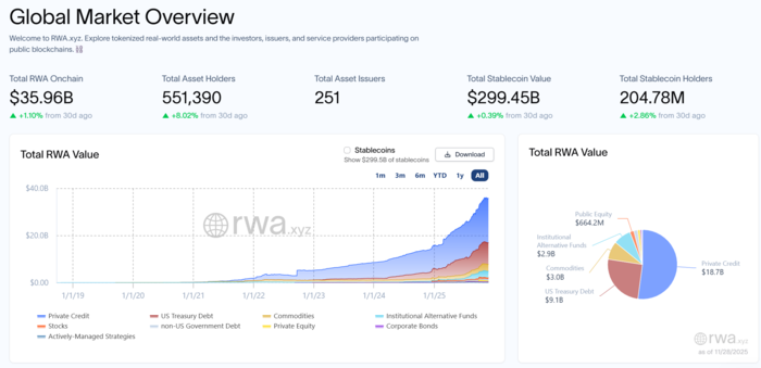 28일 글로벌 RWA 분석업체 RWA.xyz에 따르면 전 세계 온체인 실물자산(RWA) 규모는 약 360억 달러(약 50조원)에 육박했다. 왼쪽 그래프는 2024년부터 급격히 가파라진 자산 성장세를, 오른쪽 차트는 사모 신용(파란색)과 미국 국채(붉은색)가 시장을 주도하고 있는 비중을 보여준다. [출처=RWA.xyz] |