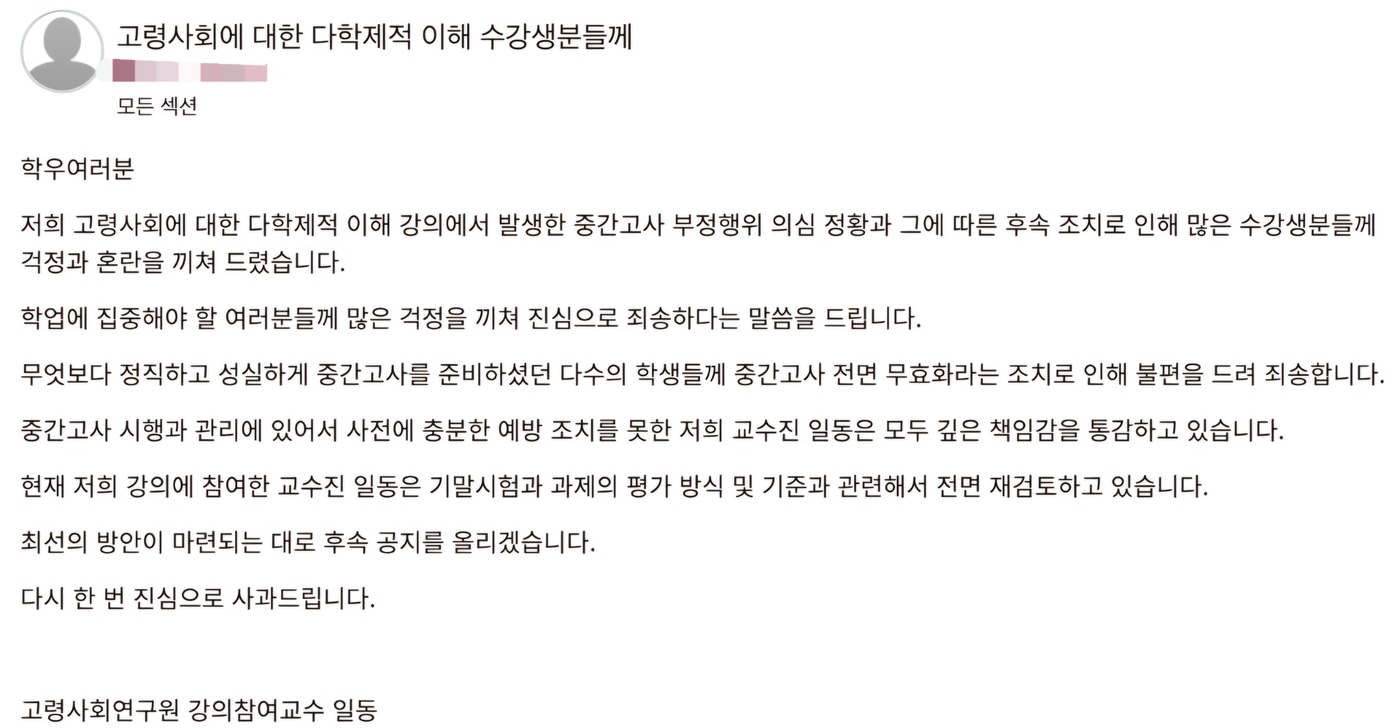 교수진은 "학업에 집중해야 할 여러분께 많은 걱정을 끼쳐 진심으로 죄송하단 말씀을 드린다"며 "무엇보다 정직하고 성실하게 중간고사를 준비하셨던 다수의 학생께 중간고사 전면 무효화라는 조치로 인해 불편을 드려 죄송하다"고 전했다.