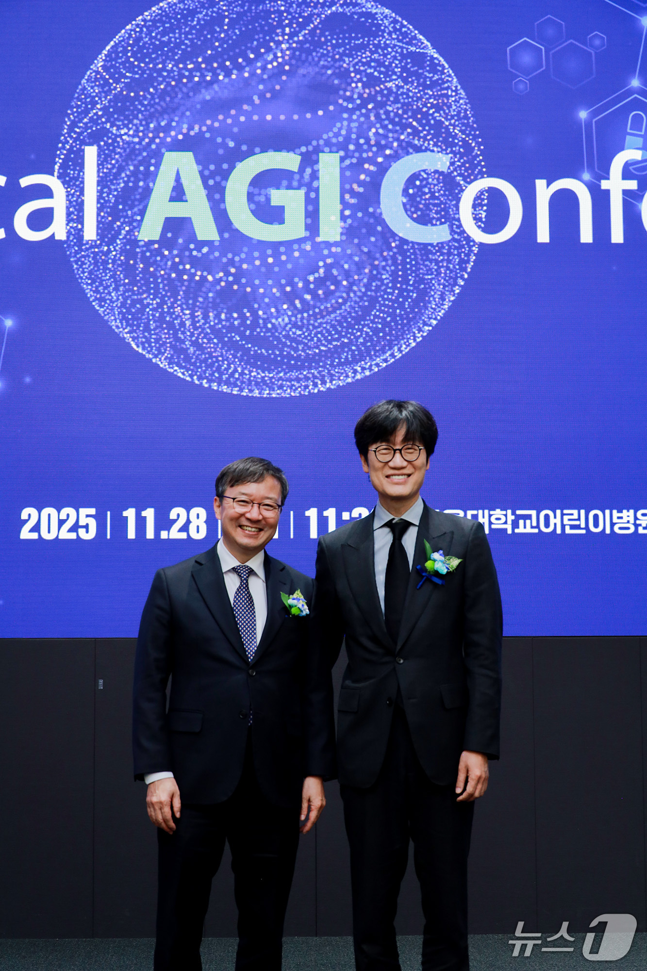 김영태 서울대학교병원장(왼쪽)과 이해진 네이버 이사회 의장이 28일 서울 종로구에 위치한 서울대학교병원에서 열린 범용의료인공지능 행사 '메디컬 AGI 콘퍼런스'에 참가했다. (네이버 제공) |
