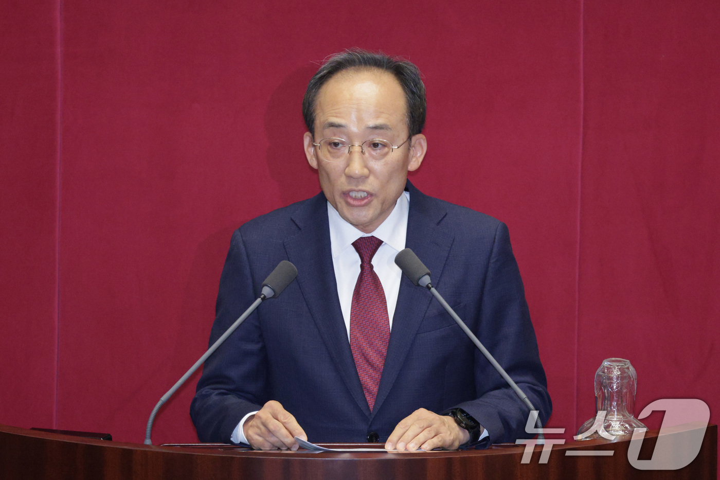 추경호 국민의힘 의원이 27일 서울 여의도 국회에서 열린 제429회국회(정기회) 제13차 본회의에서 자신의 체포동의안에 대한 신상 발언을 하고 있다. 2025.11.27/뉴스1 ⓒ News1 신웅수 기자 |