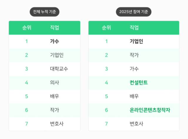 28일 네이버는 올해 신규 등록된 인물정보를 분석한 '2025 인물 결산'을 공개했다. 최다 신규 등록·업데이트 직업은 기업인이었으며 지난해에 비해 컨설턴트와 온라인콘텐츠창작자(크리에이터)의 참여 증가가 두드러졌다.