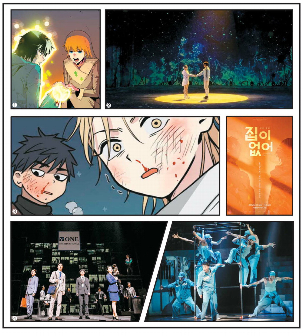 ① 웹툰 '나 혼자만 레벨업'의 한 장면. 카카오페이지 ② 라이브아레나가 지난해 선보인 뮤지컬 아이스쇼 'G-SHOW : THE LUNA'. 올해 '나 혼자만 레벨업 on ICE'를 선보인다. 연합뉴스 ③ 네이버웹툰 '집이 없어'의 한 장면(왼쪽)과 동명 원작을 무대로 옮긴 창작 초연 뮤지컬 '집이 없어' 포스터. 네이버웹툰·할리퀸크리에이션즈 ④ 일본 뮤지컬 '미생' 스틸컷(왼쪽)과 뮤지컬 '이태원 클라쓰' 초연 무대. 호리프로·도호 연극부 |