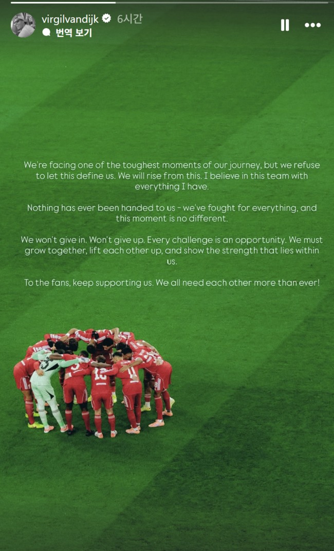 위기를 겪고 있는 상황에 주장이 직접 목소리를 냈다. 반 다이크는 28일 자신의 SNS를 통해 "우리는 축구 여정에서 가장 힘든 순간중 하나를 마주하고 있다. 그러나 이 순간이 우리를 정의하도록 내버려 두지는 않을 것이다. 우리는 반드시 이 위기에서 일어설 것이다. 난 이 팀을 있는 힘껏 믿는다"라고 운을 뗐다.