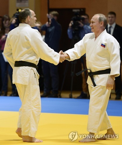 2016년 소치에서 열린 러시아 국가대표 훈련에서 유도복을 입은 블라디미르 푸틴 러시아 대통령(오른쪽) [AP 연합뉴스 자료사진. 재판매 및 DB 금지] |