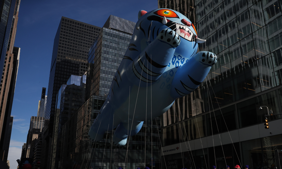 27일(현지시간) 미국 뉴욕에서 추수감사절을 맞아 열린 이날 퍼레이드에는 더피의 대형 풍선이 맨해튼의 마천루 사이를 4km 가량 행진했다. 메이시스 퍼레이드는 미국의 고급 백화점 체인인 메이시스가 개최하는 추수감사절 행사로 1924년 시작돼 올해로 99회째를 맞는다. 미국의 최대 명절인 추수감사절을 상징하는 가장 화려한 행사로 꼽힌다.