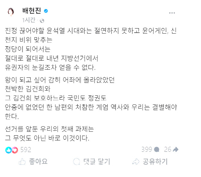 배 의원은 29일 페이스북에 “윤어게인, 신천지 비위 맞추는 정당이 돼서는 절대로 내년 지방선거에서 유권자의 눈길조차 얻을 수 없다”고 적었다. 장동혁 대표 체제 출범 이후 이어지고 있는 ‘통합’ 기조가 오히려 민심과 엇박자를 내고 있다는 비판이다. 배 의원은 글에서 김건희 씨를 먼저 언급하며 윤 전 대통령을 ‘한 남편’으로 지칭했다. “김건희를 보호하느라 국민도 정권도 안중에 없었던 한 남편의 처참한 계엄 역사”라는 표현으로, 지난해 비상계엄의 동기가 김건희 씨 논란과 무관하지 않다는 뉘앙스를 남겼다.