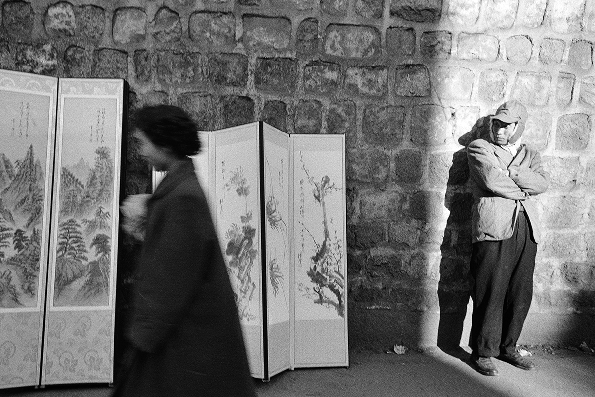서울 소공동 조선호텔 옆이다. 한영수는 거리에서 옛 병풍을 파는 행상을 만난다. 아직은 한기가 남아있는 어느 이른 봄날이었을까? 귀까지 내려오는 모자를 쓴 노점상은 팔짱을 끼고 햇살 속에 몸을 기댄다. 그이 앞을 지나는 파마 머리의 모던 걸. 희미하게 흔들리며 포착된 여인의 실루엣은 병풍 속의 산수화와 아슬아슬하게 조화를 이룬다. 재밌는 것은 노점상의 시선인데, 그이는 이 여인을 바라보고 있지는 않다. 하지만 그는 분명히 그녀의 존재를 의식하고 있는데, 그가 의도적으로 딴 곳을 쳐다보고 있기 때문이다.