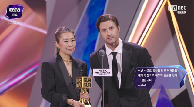 이날 올해의 뮤직 비저너리상은 '케데헌'에게 돌아갔다. 매기 강 감독과 공동 연출자 크리스 아펠한스 감독은 무대에 올라 홍콩 화재 참사에 애도를 표했다. 매기 강 감독은 "이번 사고로 영향을 받은 분들께 진심으로 애도의 말씀을 전한다"며 "지금 현장에서 애써주는 구급대원 여러분들께는 감사의 말씀을 드린다"고 말했다. 크리스 아펠한스는 '케데헌'에 대해 "K-팝에게 보내는 러브레터"라며 "여러분들과 이 자리에 함께 하면서 혼문의 강한 힘을 느끼는 것 같다"고 했다.