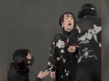 일본 가수 오오츠키 마키가 28일 중국 상하이에서 무대를 하던 도중 불이 꺼지고 스태프들이 무대에 올라와 오오츠키 마키를 무대에서 내려가게 했다./X |