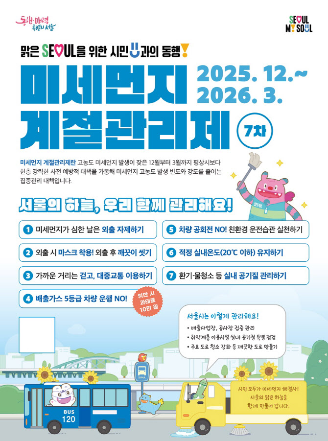 권민 서울시 기후환경본부장은 “겨울철마다 반복되는 고농도 미세먼지로부터 시민의 건강을 지키기 위해서는 선제적인 배출 저감과 생활공간 노출 최소화가 무엇보다 중요하다”며 “‘제7차 미세먼지 계절관리제’가 수송·난방·사업장·생활권 전반에 걸친 촘촘한 대책으로 실제 대기질 개선으로 이어질 수 있도록 시민 여러분의 적극적인 참여와 협조를 부탁드린다”고 말했다.