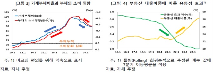 또한 가계부채 증가분의 약 3분의 2가 주택담보대출로, 실물 소비보다 자산 매매에 유입되면서 소비 진작 효과가 크지 않았다는 설명이다. 비주택 부동산(상가·오피스텔) 투자 대출의 경우 공실 증가로 현금흐름이 악화되며 오히려 소비 제약 요인으로 작용한 것으로 나타났다.