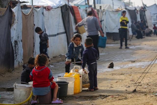 29일 가자지구 중부 누세라이트 난민촌에서 팔레스타인 어린이들이 수다를 떨고 있다. 누세라이트=AFP 연합뉴스 |